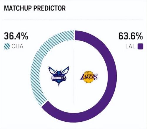 這是兩隊(duì)本賽季的第二次交鋒,上一場交手,湖人隊(duì)以10分之差大勝黃蜂。賽前,美媒ESPN對本場比賽進(jìn)行了勝率預(yù)測,湖人勝率為63.6% ,優(yōu)勢明顯,黃蜂隊(duì)勝率則僅有36.4%。