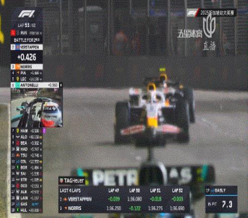 第49圈,維斯塔潘利用克拉平托的慢車卡在諾里斯身前,為自己爭取了0.4秒左右的時間,但差距依舊在1秒以內(nèi)!隨著諾里斯也超過克拉平托,雙方身前已無慢車!真正的對決開始!